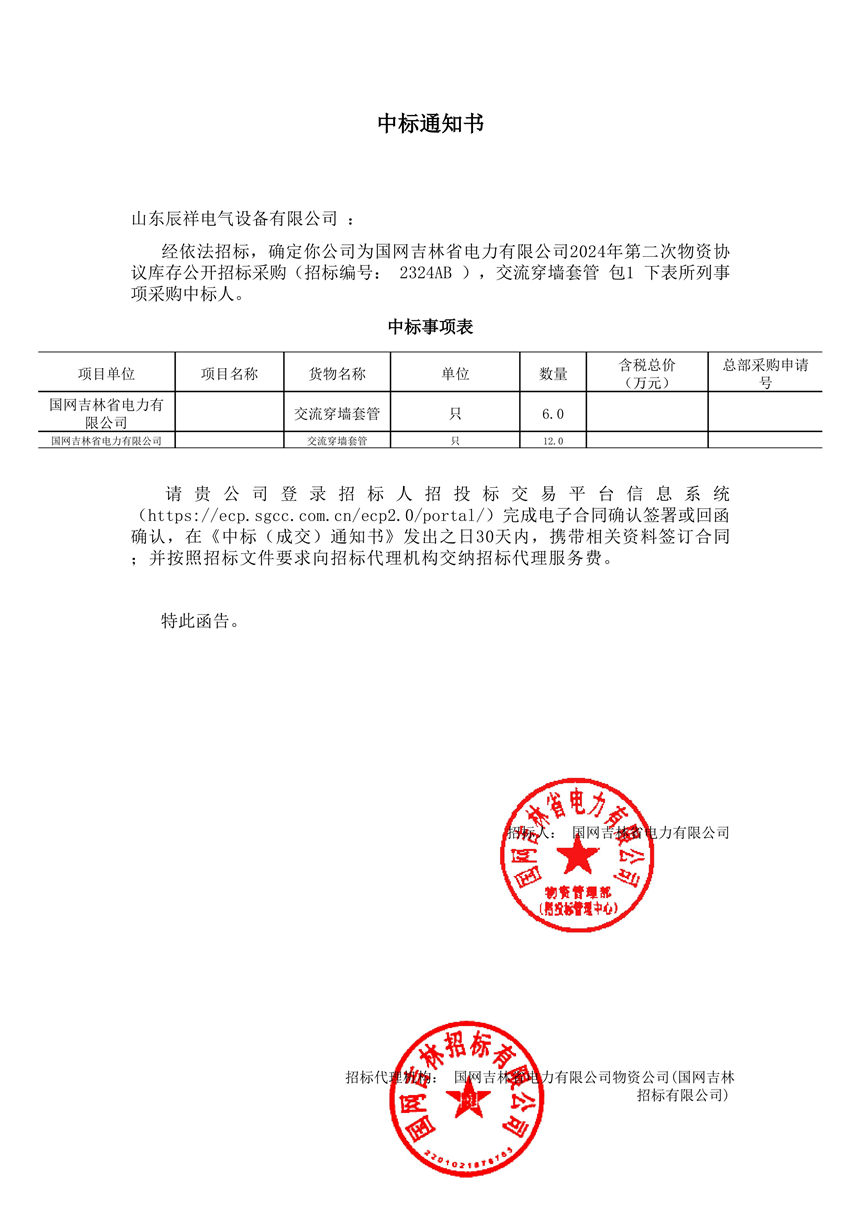 • 2025.02.14 110kV瓷絕緣穿墻套管中標通知書